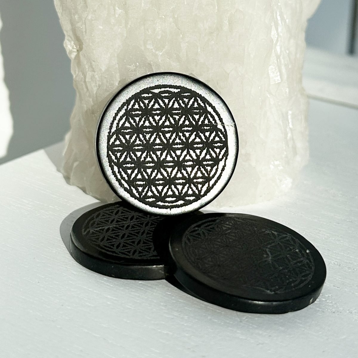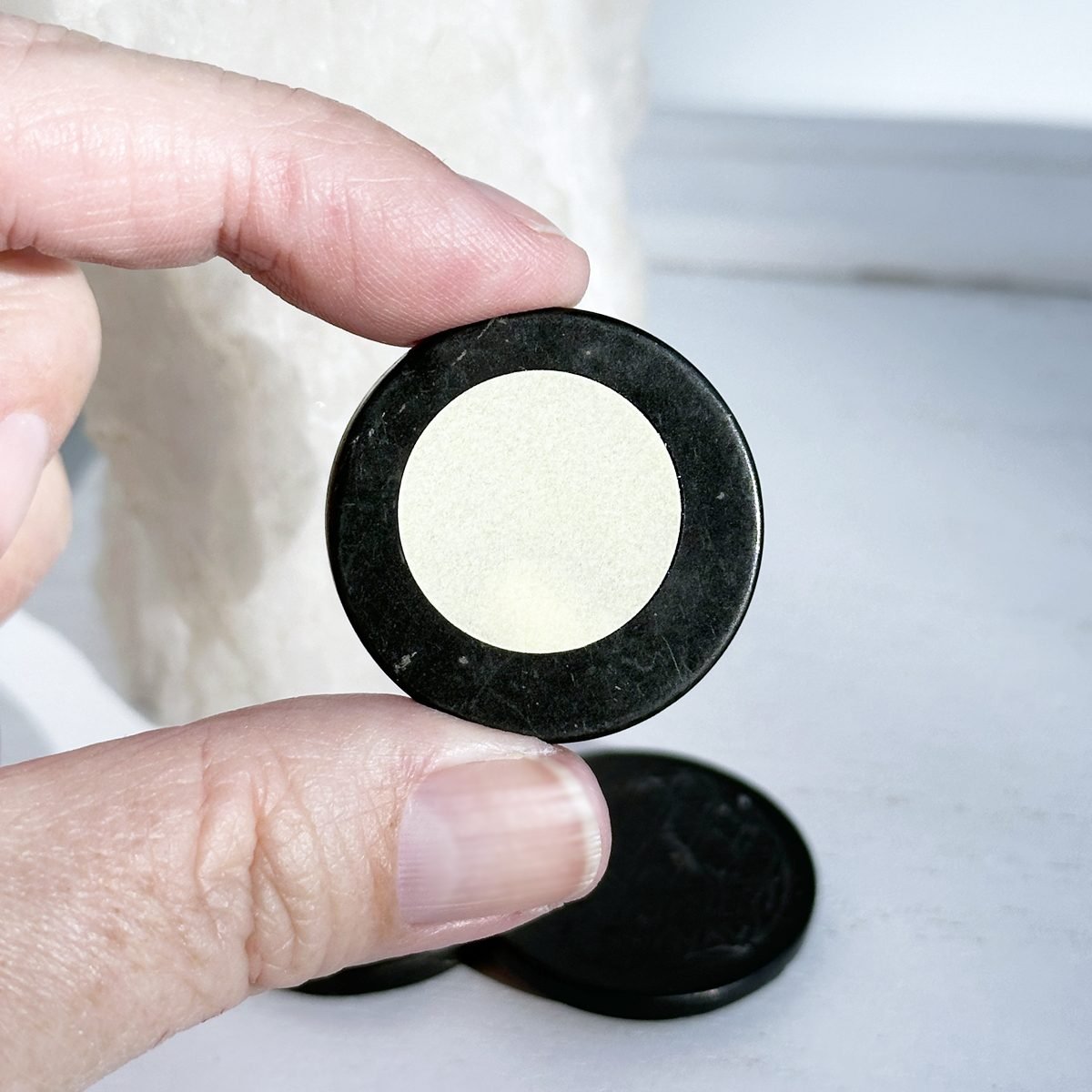 These Shungite Cell Phone Stickers combine ancient energy with modern intention. Each genuine Shungite disc features a delicately engraved Flower of Life – a sacred geometry symbol representing harmony, creation, and divine protection. Together, Shungite and this ancient pattern amplify grounding energy while helping to neutralize EMFs from your phone, tablet, or laptop. You can place them directly on devices, or keep the sticker covered to use in other places.
