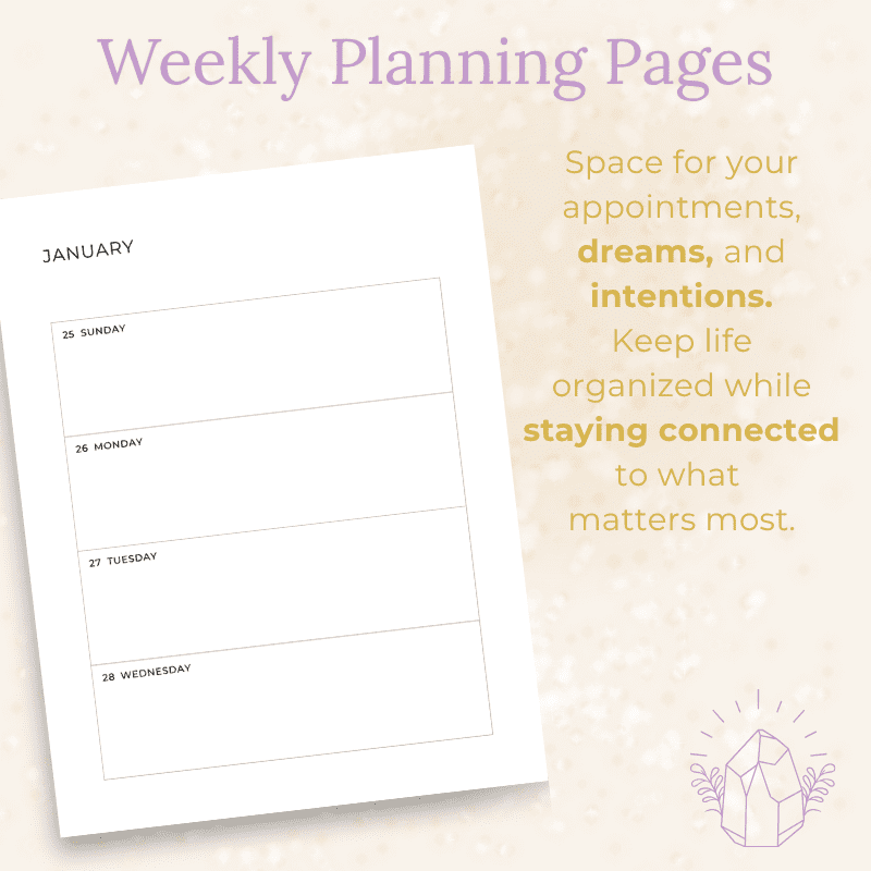 The Aligned Year: 2026 Weekly Planner was created for crystal lovers, intuitive dreamers, and mindful doers who want to organize life in a way that actually feels good. It’s more than a planner — it’s a guide to living with intention, rhythm, and flow.