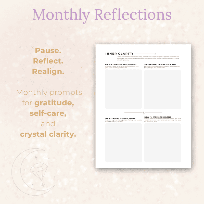 Inside, you’ll find beautifully simple layouts that keep you focused without the clutter: weekly spreads with space to breathe, monthly dashboards to reset your priorities, and gentle prompts to help you realign when life gets busy. Every page invites a pause — a moment to remember what truly matters. Crystal energy tips weave throughout, grounding your days in nature’s cycles and your own inner wisdom.